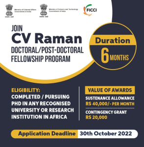 About the Award: The Department of Science and Technology (DST) and Ministry of External Affairs (MEA), Government of India (GoI), through the Federation of Indian Chambers of Commerce & Industry (FICCI) have launched the C.V. Raman Fellowship for African Researchers programme under the India-Africa Forum Summit to promote human capacity building through scientific and technological cooperation between Africa and India.