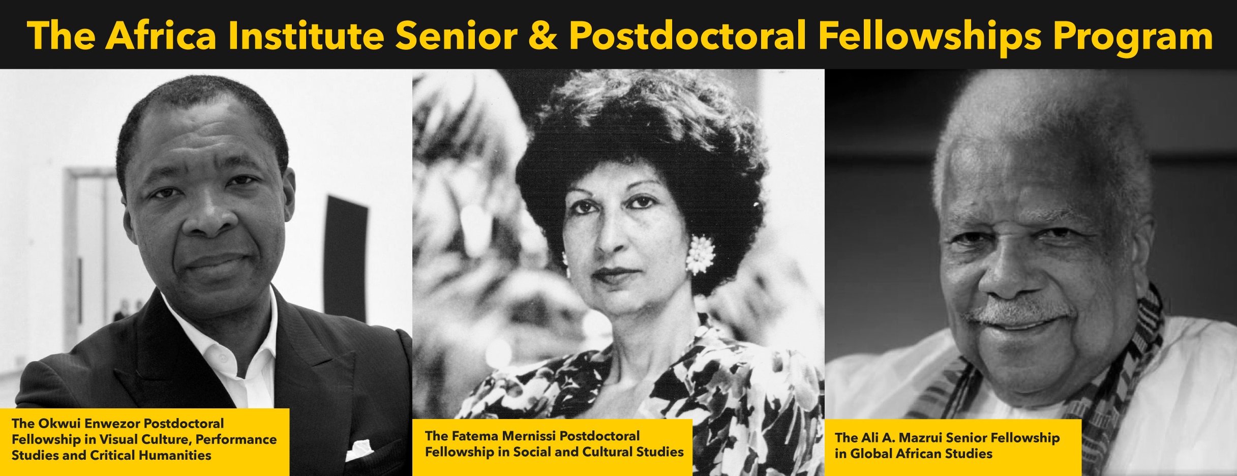 The Africa Institute welcomes applications for the Okwui Enwezor Postdoctoral Fellow in Visual Culture, Performance Studies and Critical Humanities; Fatema Mernissi Postdoctoral Fellow in Social and Cultural Studies; Ali A. Mazrui Senior Fellow in Global African Studies.