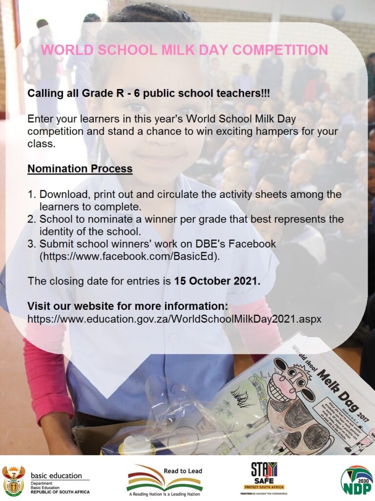 This year, the DBE, through the NSNP in collaboration with the Milk Producers Organisation (MPO) and Consumer Education Project of Milk South Africa (CEP), is running a virtual campaign for World School Milk Day 2021. The competition is open for all public schools from grade R-6. The teacher is expected to develop and present the lesson plan on dairy farming (from CAPS document) over the WSMD period. Using the activity sheets created by the Consumer Education Project of Milk South Africa (CEP) with DBE inputs, the competition is utilised as a tool to assess if a learner can comprehend what they have been taught. The activity sheets focus on the CAPS document for the Foundation and Intermediate Phases where dairy and nutrition is the prescribed topic.