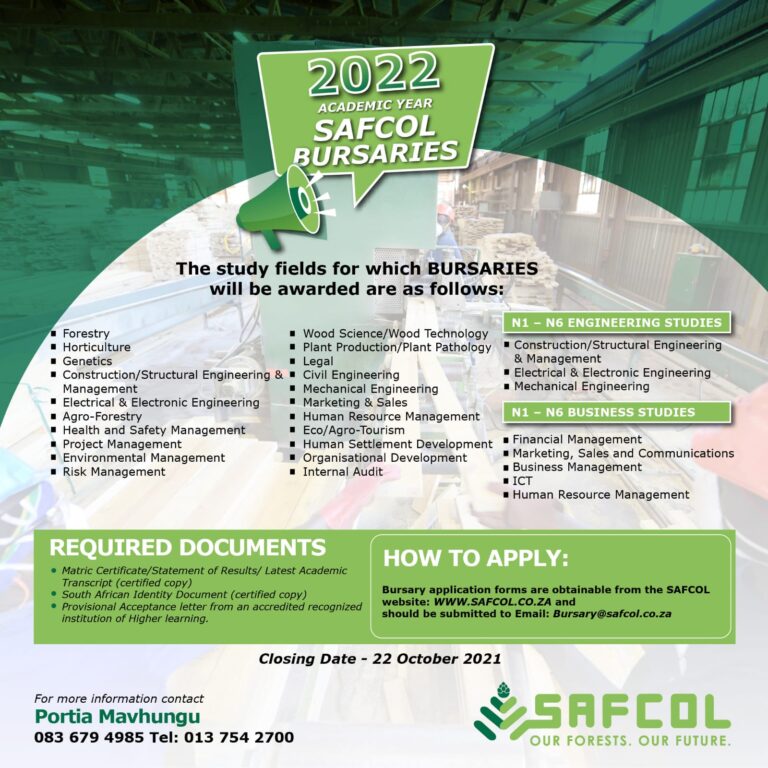 About South African Forestry Company Limited (SAFCOL) Bursary: The South African Forestry Company Limited (SAFCOL) is mandated by the SA Government to ensure the sustainable management of forests and other assets within the SAFCOL Group and to play a catalytic role in the realisation of rural development and economic transformation. Also Read: SAFCOL Artisan Development Apprenticeship Programme 2022 for Unemployed South African Youths