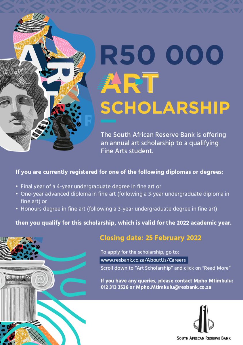 Applications are open for the South African Reserve Bank (SARB)’s annual art scholarship for the academic year 2022. The annual arts scholarship is available to the qualifying students of Fine Arts in South Africa. A Fine Arts student may apply for the scholarship for their final year of undergraduate degree studies.