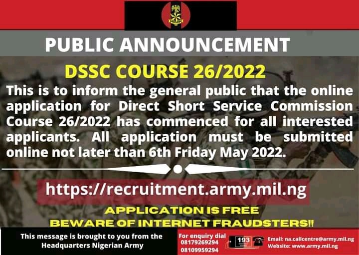 This is to inform the general public that the online application for Direct Short Service Commission Course 26/2026 has commenced.