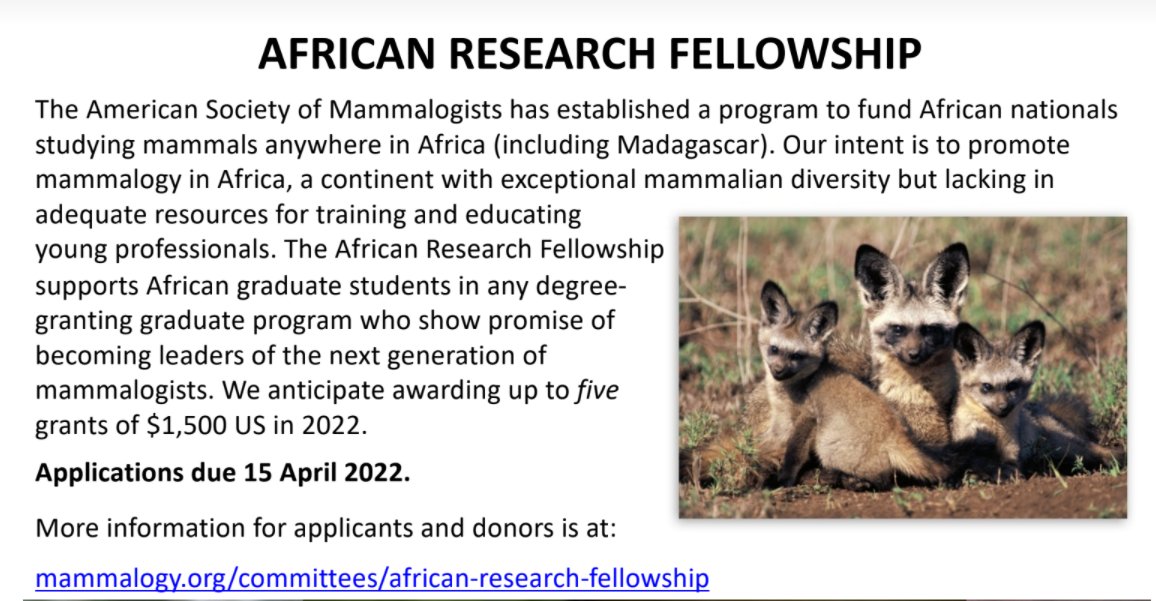 nationals working on wild mammals in Africa. - Eligible students must be citizens of African countries and currently enrolled in a graduate program.