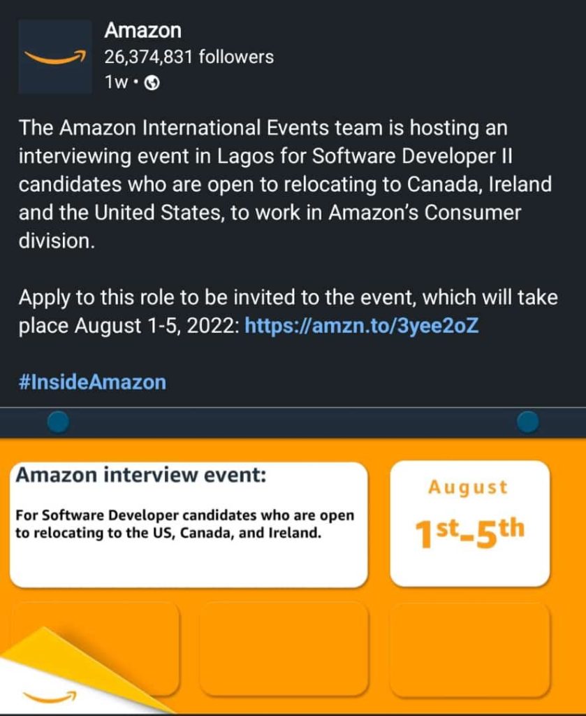 Amazon Software Developer II Recruitment Drive 2022 – Relocate to Canada, Ireland or the US