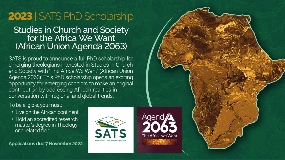 SATS is proud to announce a full PhD scholarship for emerging theologians interested in Studies in Church and Society with ‘The Africa We Want’ (African Union Agenda 2063). This PhD scholarship opens an exciting opportunity for emerging scholars to make an original contribution by addressing African realities in conversation with regional and global trends.