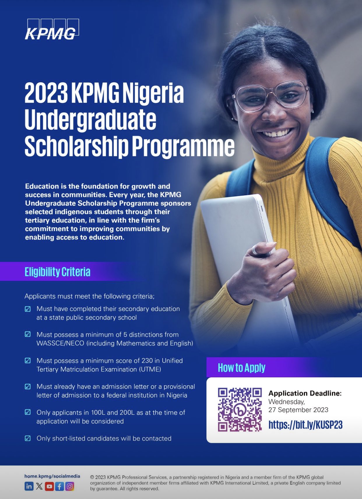 Visit KPMG Nigeria University Scholarship Webpage for details to apply