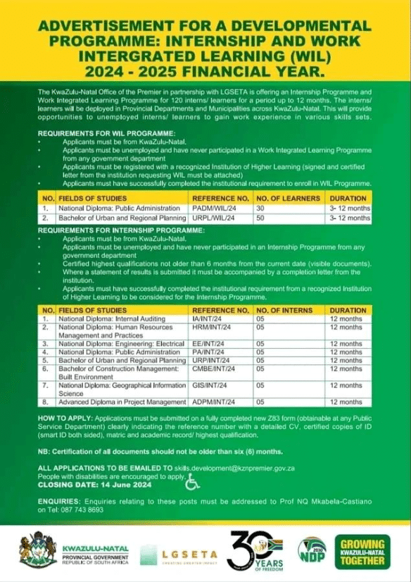 Applications should be emailed to: skills.development@kznpremier.gov.za