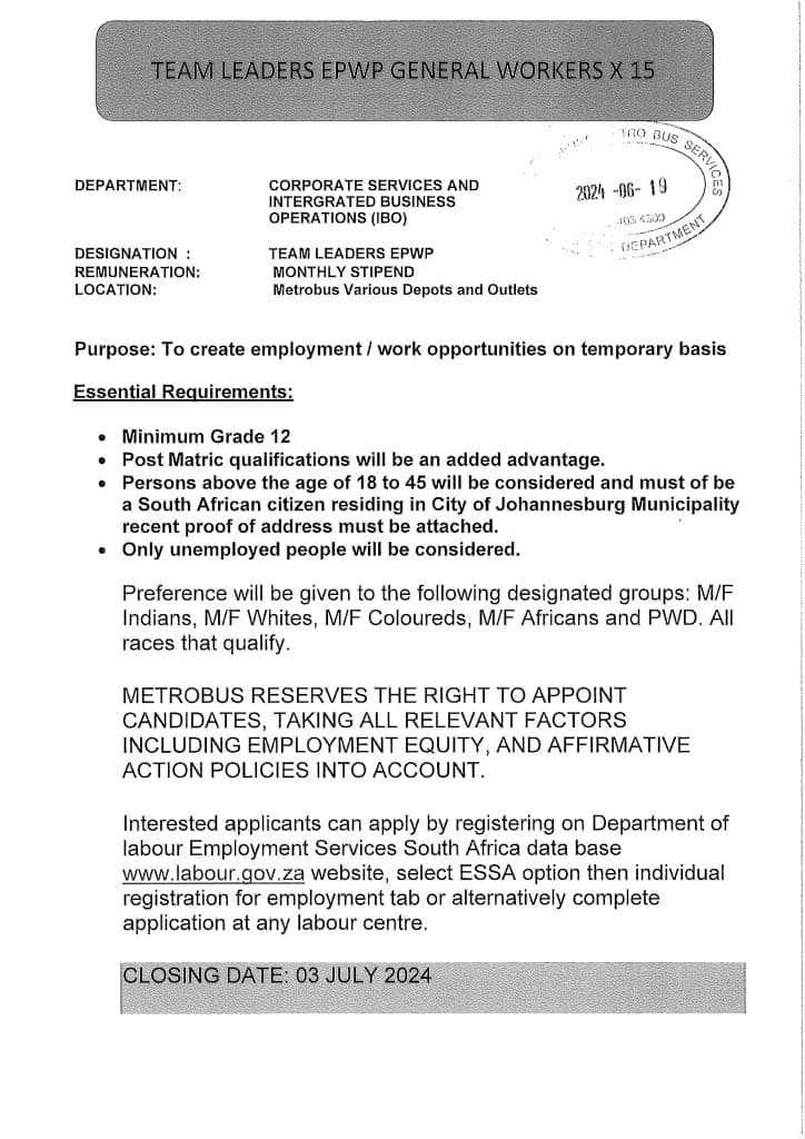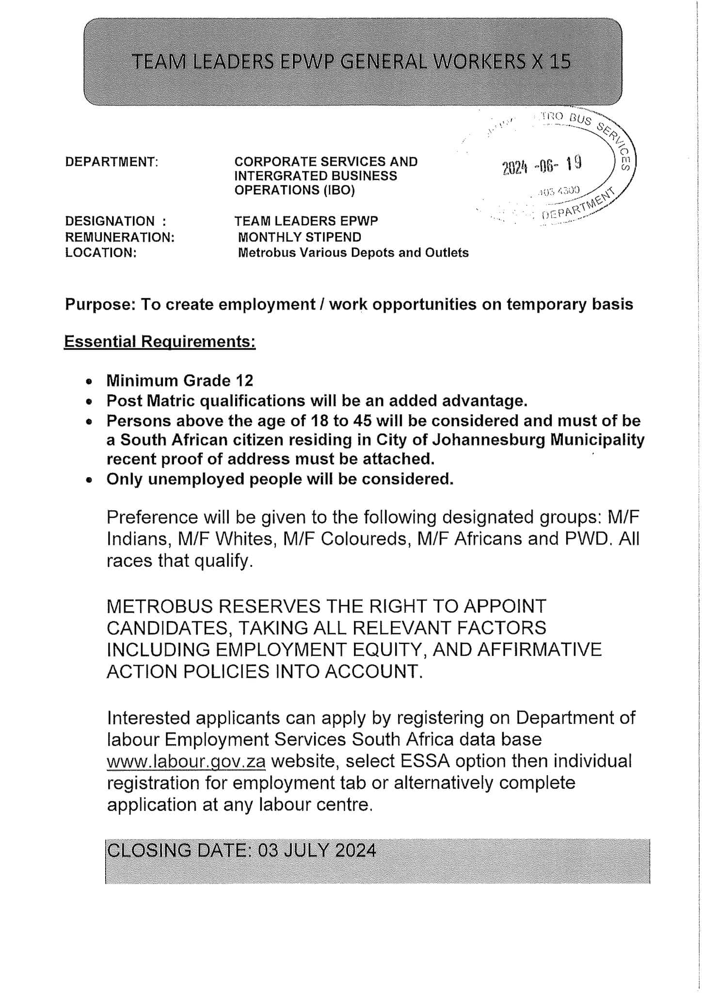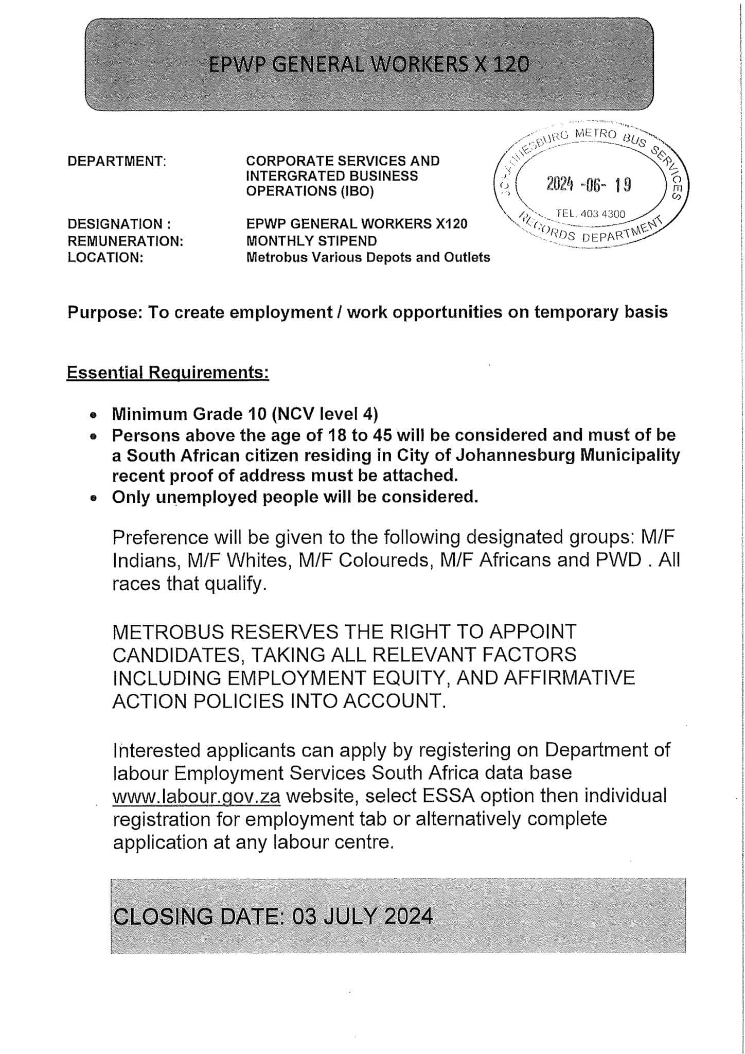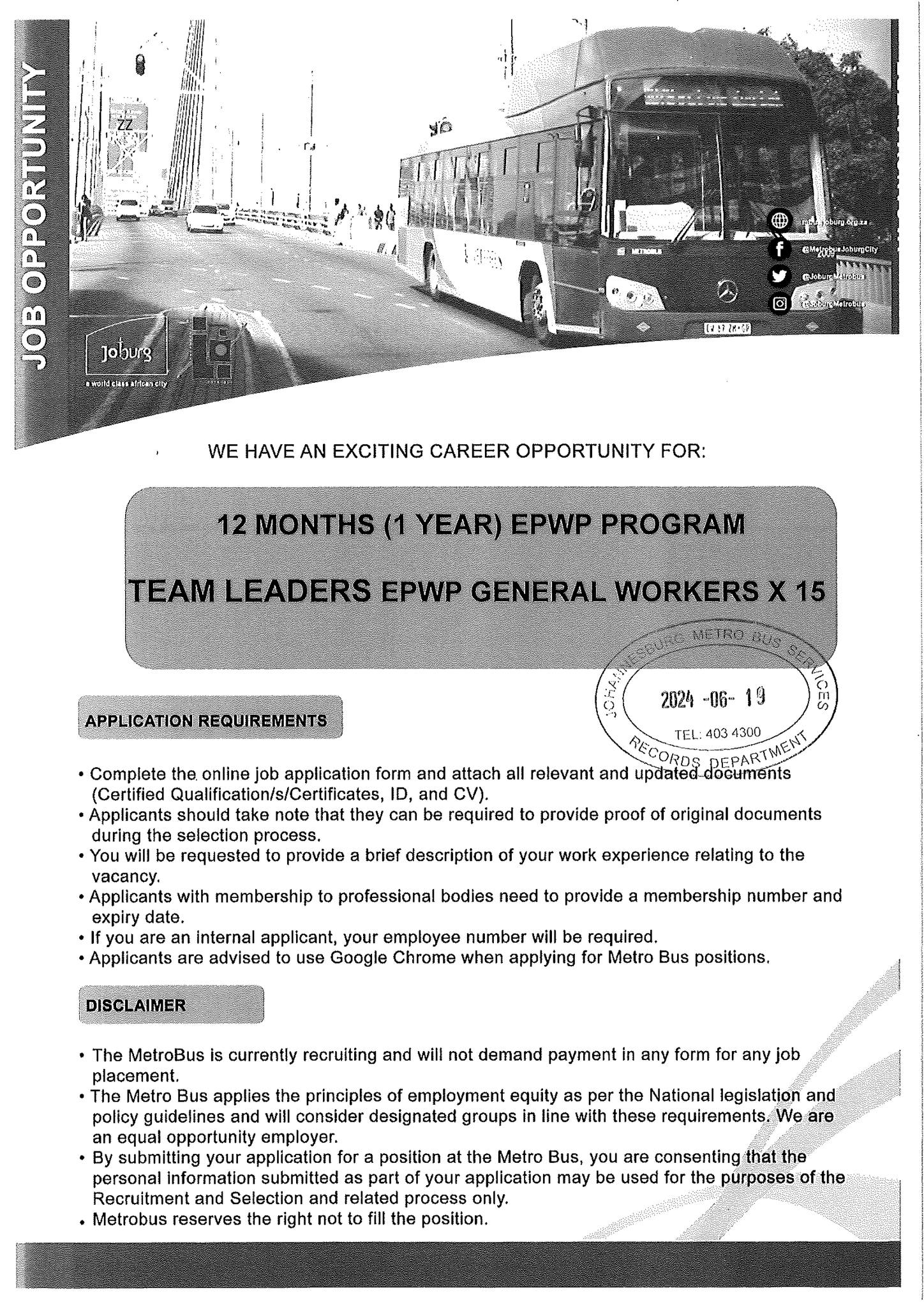 Johannesburg Metrobus EPWP Recruitment Program 2024 for South African Citizens. Apply below.