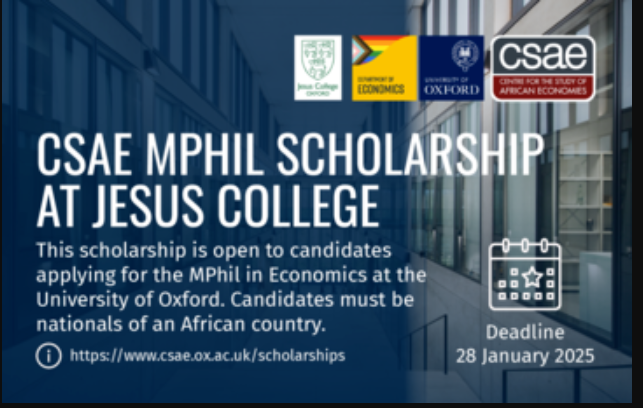 - CSAE MPhil Scholarship at Jesus College: Covers full course fees and provides a stipend for living costs for the two-year MPhil in Economics program.