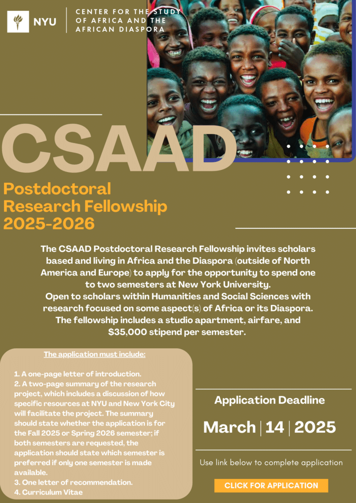 The CSAAD Research Fellowship invites scholars based and living in Africa and the Diaspora (outside of North America and Europe), who have completed the PhD within the last four years to submit applications for the opportunity to spend either one or two semesters at New York University. The fellowship is open to scholars in the Humanities and Social Sciences, and the research must focus on some aspect(s) of Africa or its Diaspora.