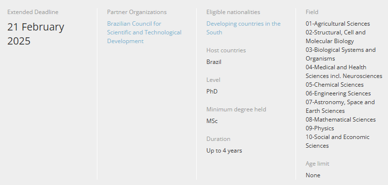 The TWAS-CNPq Postgraduate Fellowship Programme is a collaboration between The National Council for Scientific and Technological Development (CNPq) in Brazil and The World Academy of Sciences (TWAS). This fellowship supports young scientists from developing countries (excluding Brazil) to conduct full-time PhD research at top Brazilian institutions.