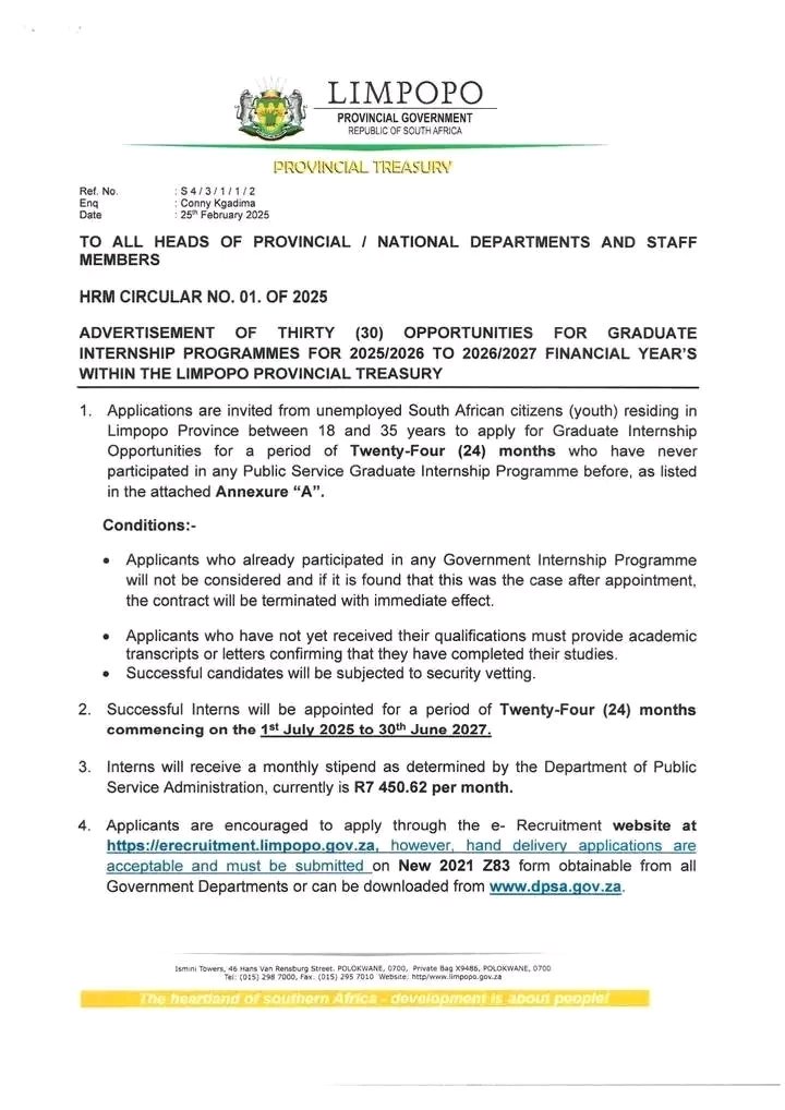1. Applications are invited from unemployed South African citizens (youth) residing in Limpopo Province between 18 and 35 years to apply for Graduate Internship Opportunities for a period of Twenty-Four (24) months who have never participated in any Public Service Graduate Internship Programme before, as listed in the attached Annexure “A”.