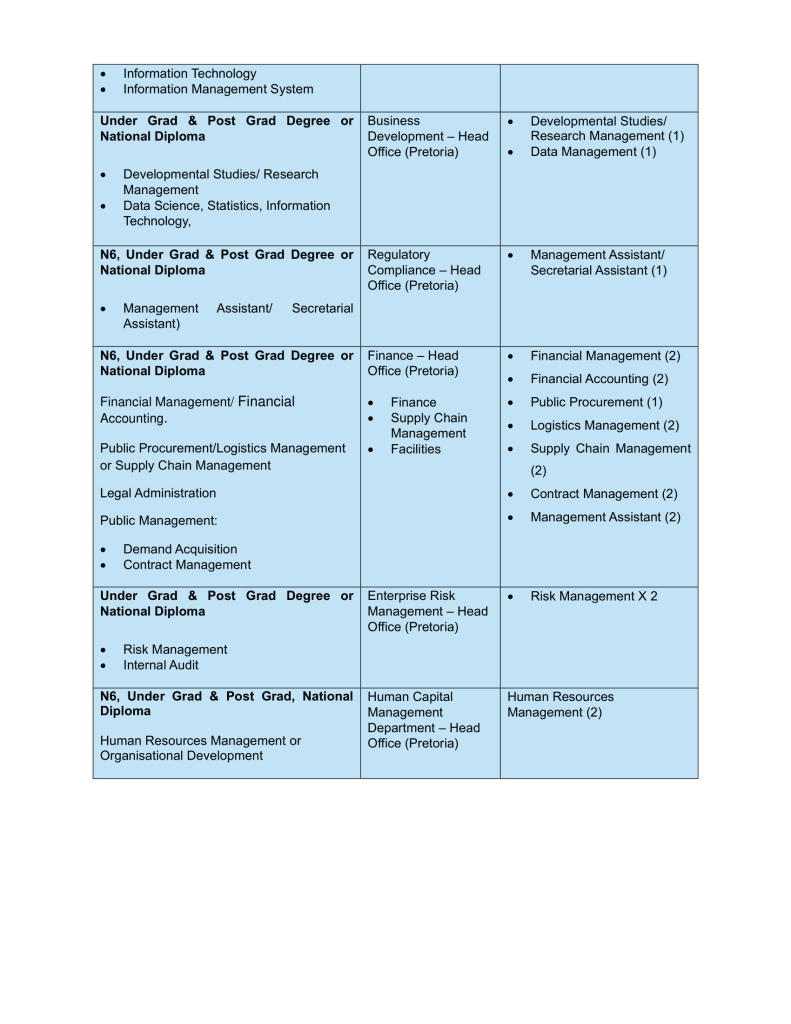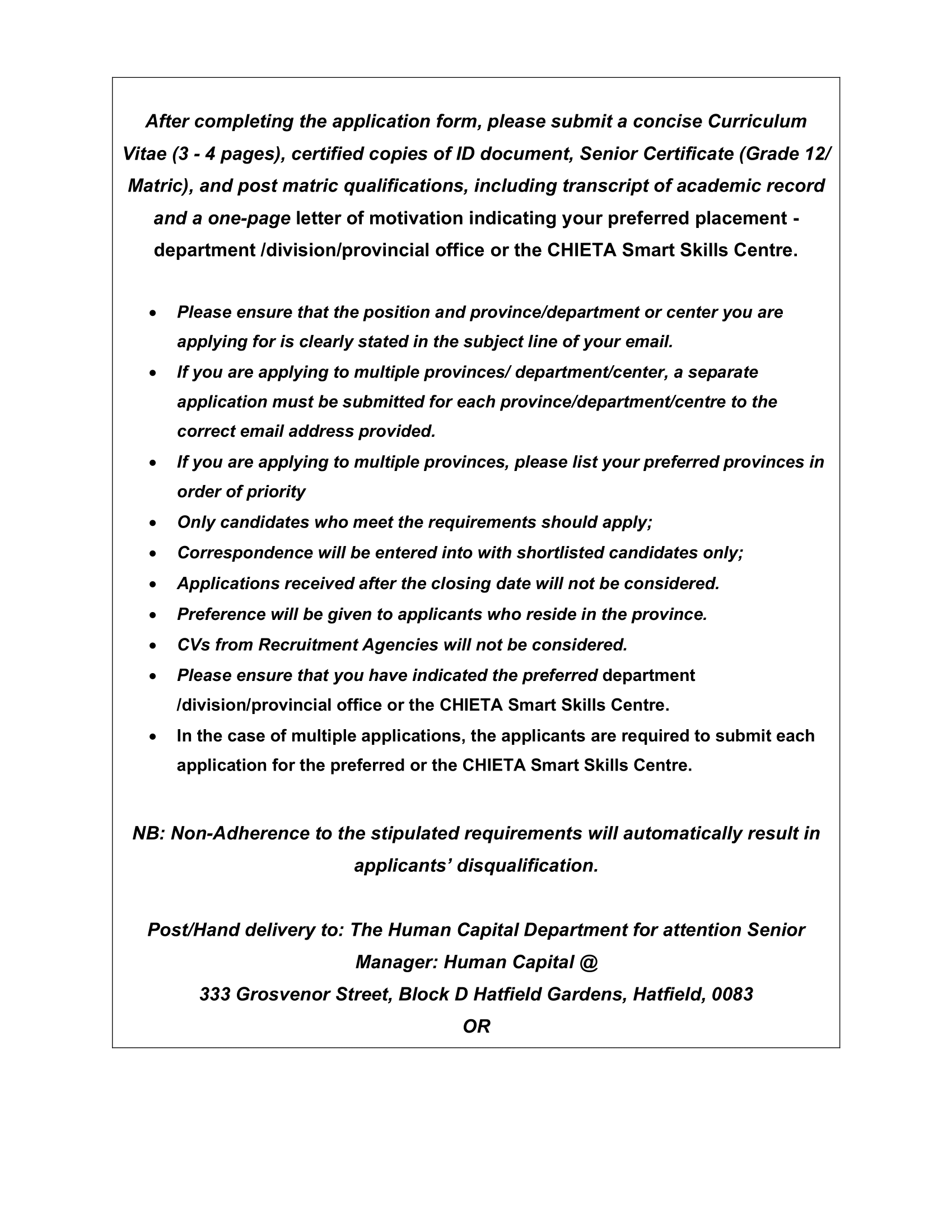 - Post/Hand delivery to: The Human Capital Department for attention Senior Manager: Human Capital @ 333 Grosvenor Street, Block D Hatfield Gardens, Hatfield, 0083 OR Email on internships@nlcsa.org.za Telephone number for queries: 012 432 1300.