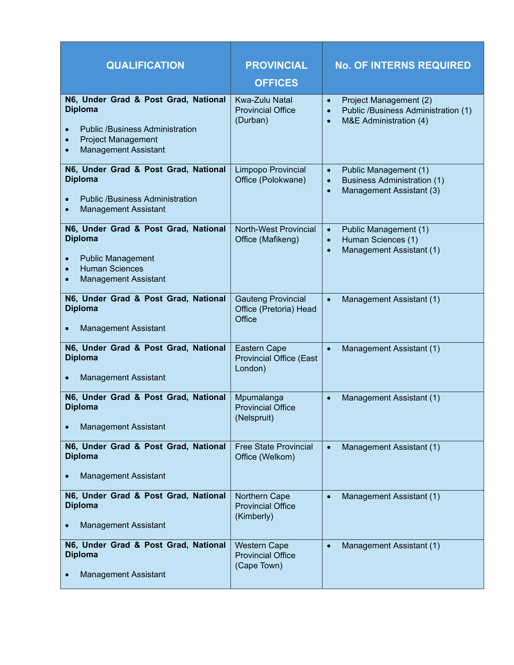 Where will Award be Taken? The successful Graduate and Student Interns will be placed in the following NLC’s divisions and Provincial Offices.