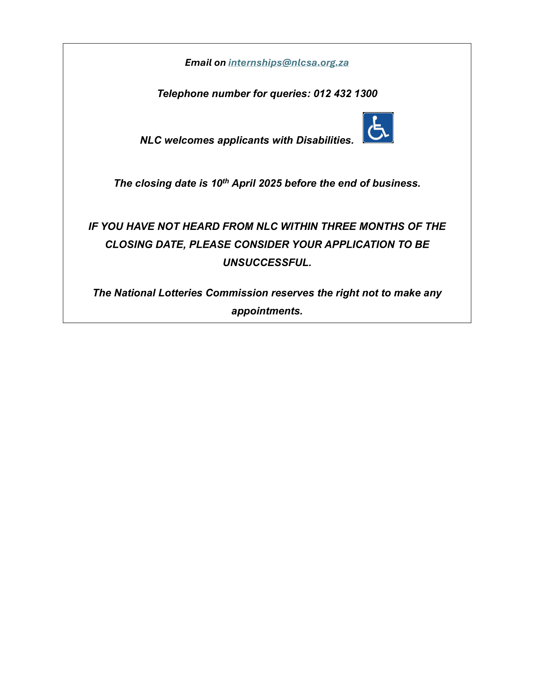 NLC welcomes applicants with Disabilities. The closing date is 10th April 2025 before end of business.