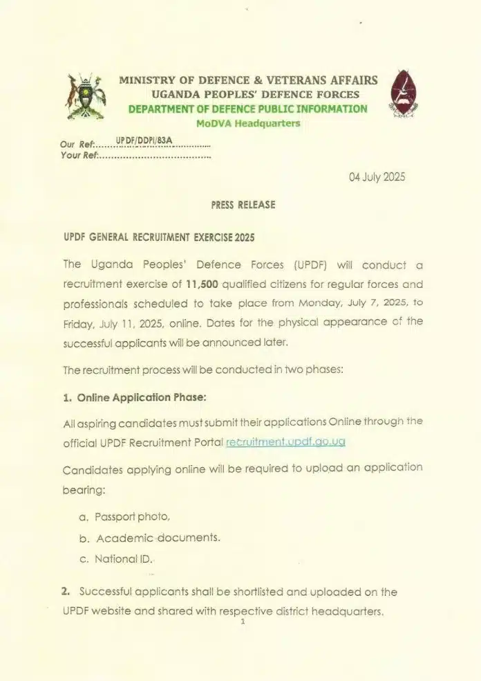 The Uganda Peoples’ Defence Forces (UPDF) recruitment exercise of 11,500 qualified citizens for regular forces and professionals scheduled to take place from Monday, July 7, 2025, to Friday, July 11, 2025, online has begun. Dates for the physical appearance of the successful applicants will be announced later.